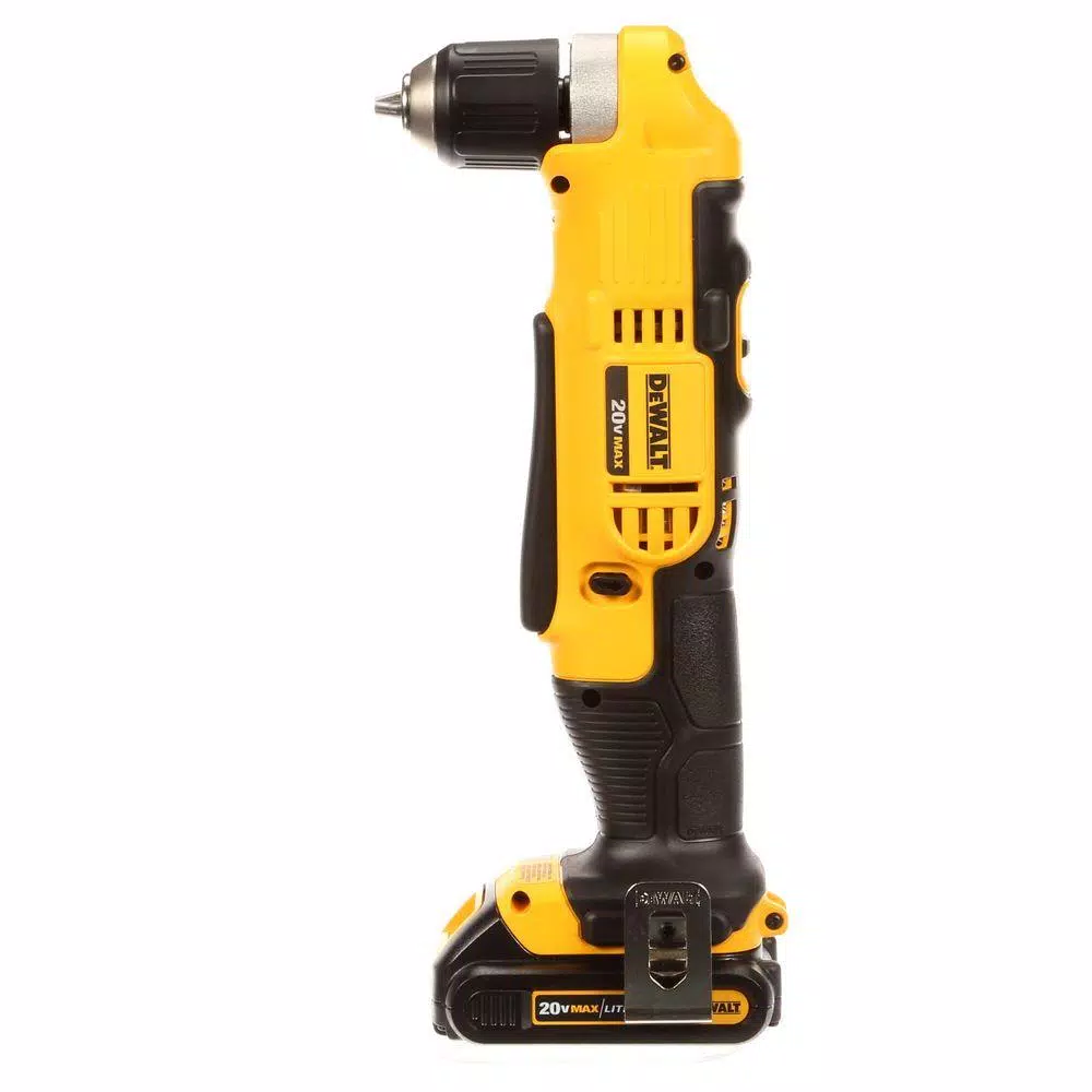 Powerful and easy to use, the DEWALT 20-Volt Max Lithium-Ion Cordless Compact Right Angle Drill is perfect for those hard to reach areas that a standard drill canβt get into. The included deep hex chuck allows you to recess the bit further back into the head of the tool, shortening the overall front to back length of the drill with a bit inserted. Featuring excellent battery power, this drill has a multi-grip trigger for comfortable use and dual speed ranges so you can match tool speed to your application.