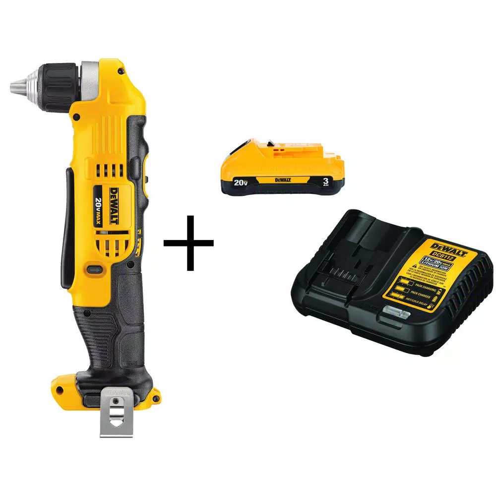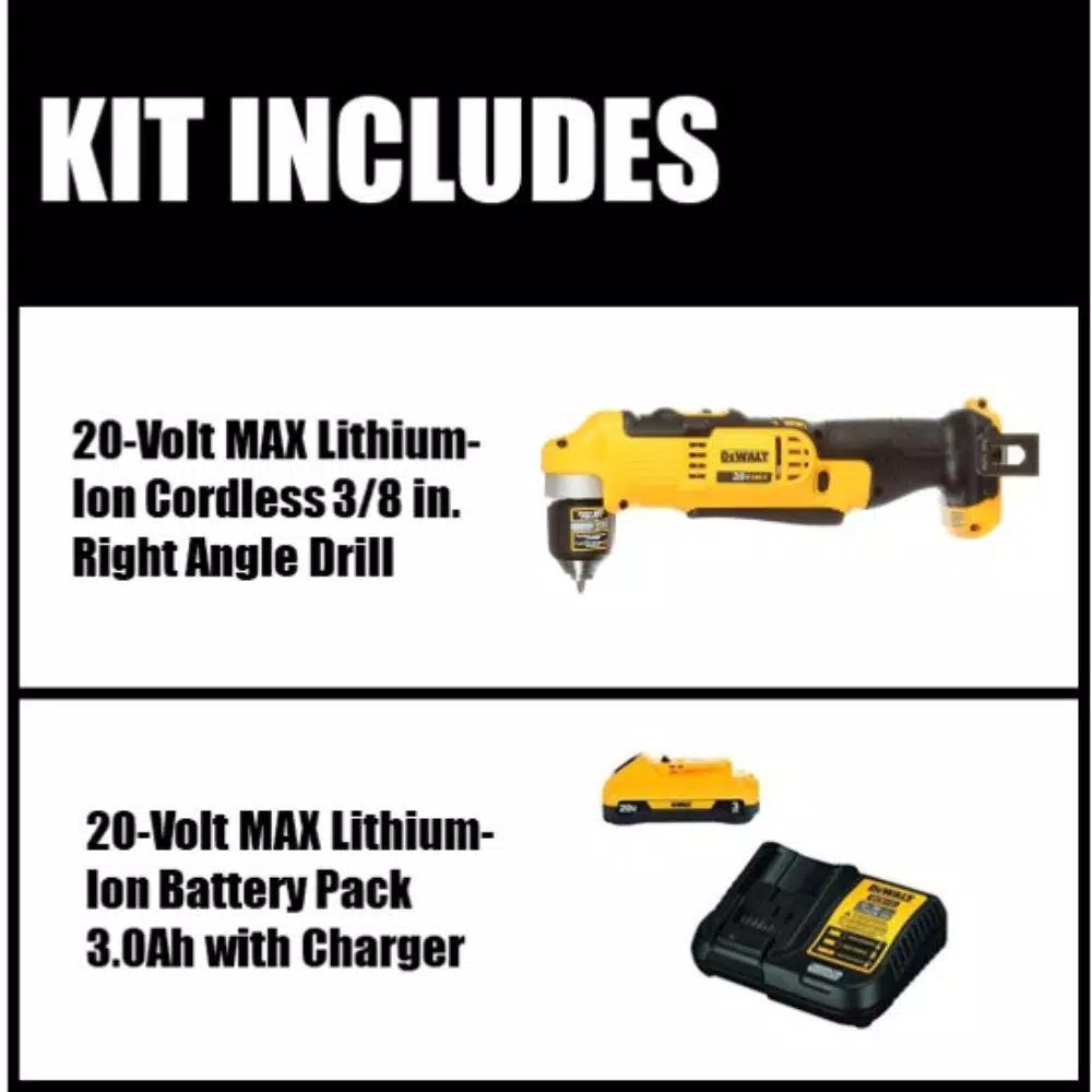 The DEWALT 20-Volt Max Lithium-Ion 3/8 in. Cordless Right Angle Drill (Tool-Only) includes a deep hex chuck so you can recess the bit further back into the head of the tool, shortening the overall front to back length of the drill with a bit inserted. Featuring dual speed ranges of 0-650 and 0-2000 RPM for increased user flexibility, this drill is ideal for tackling a wide range of applications. Easy to use and control with a multi-grip trigger for comfort and convenience, you can easily work in tighter spaces while still having access to the trigger. Durably made, sturdy and a good size and weight, use with confidence for DIY projects or on the jobsite.