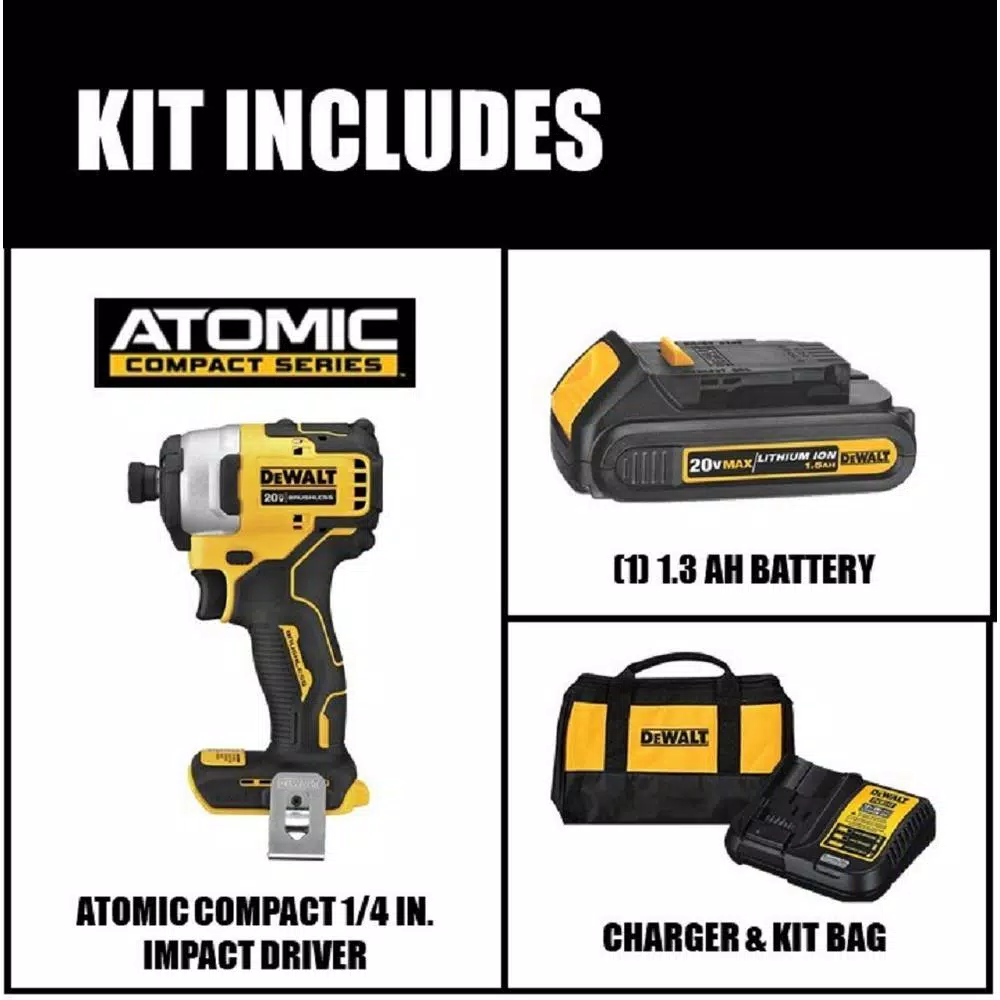 - Includes (1) DCF809B ATOMIC 20-Volt MAX Cordless 1/4 in. Impact Driver, (1) 20-Volt Max Lithium-ion 1.3 Ah battery pack, 20-Volt Max charger and tool bag.