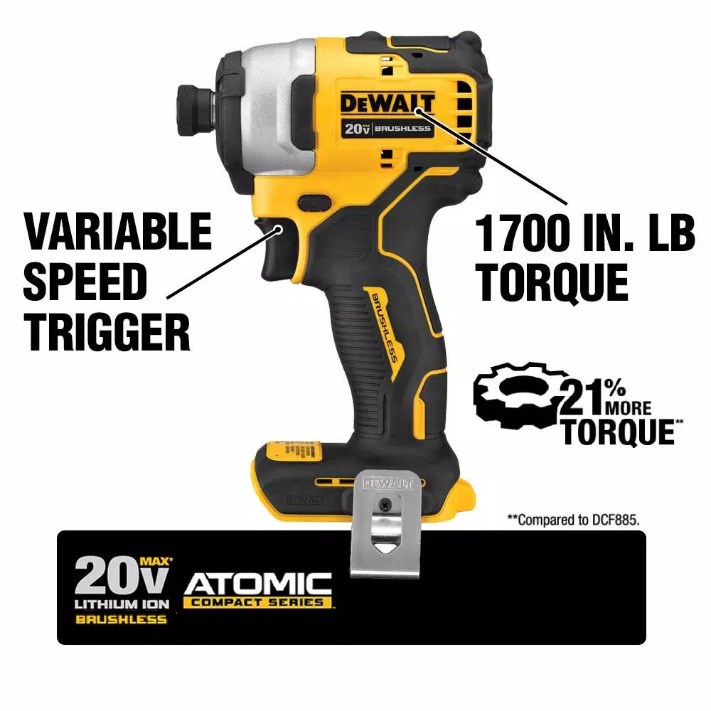This 20V MAX* Compact Brushless Impact Driver Set includes one 20V MAX* Lithium Ion Battery, one charger, and a carrying bag. At only 5.1 in. front to back, this Cordless Impact Driver features a high-performance brushless motor that delivers 1700 in-lbs. of torque. It also has 3 LED lights to provide optimum illumination in dark spaces as you work. For increased comfort, the handle of this electric impact driver features an ergonomic design for balance and easier tool control along with a removable belt hook. The DCF809C1 1/4 in. Impact Driver Set is backed by a DEWALT 3-year limited warranty so you can buy with confidence.