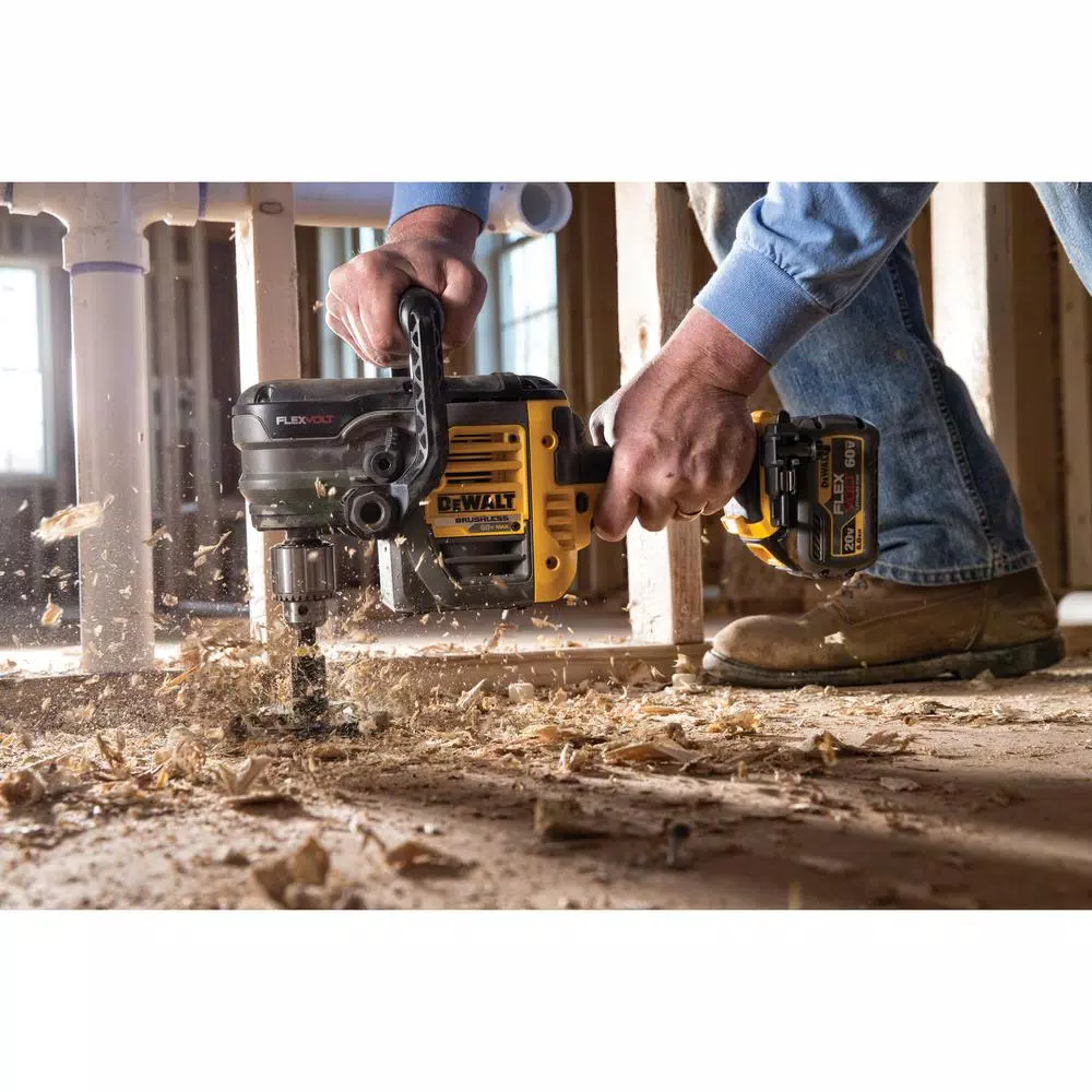 The DEWALT 60-Volt Max VSR Stud and Joist Drill with E-Clutch System features a 1/2 in. chuck and brushless motor that provides corded power in a cordless solution. Ideal for plumbers, electricians and HVAC installers who need to drill large diameter holes in wood. This drill provides exceptional power, control, durability, and runtime with its 60-Volt brushless motor, mechanical and electrical clutches, and 2 variable-speed ranges. Equipped with the innovative bind-up control feature called E-Clutch System this drill increasing user control in bind-up/stall situations by sensing a stall during use and managing torque accordingly. For a limited time get a bonus bare 20-Volt Max Impact Wrench with purchase.