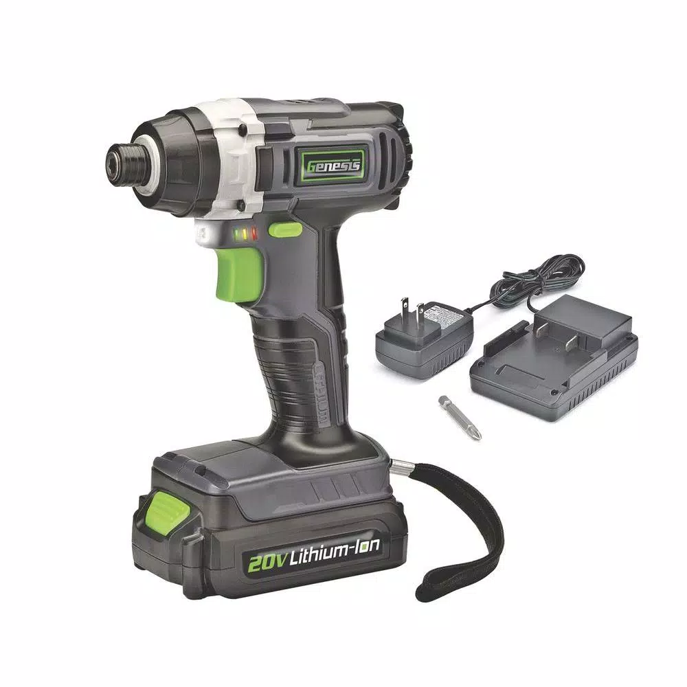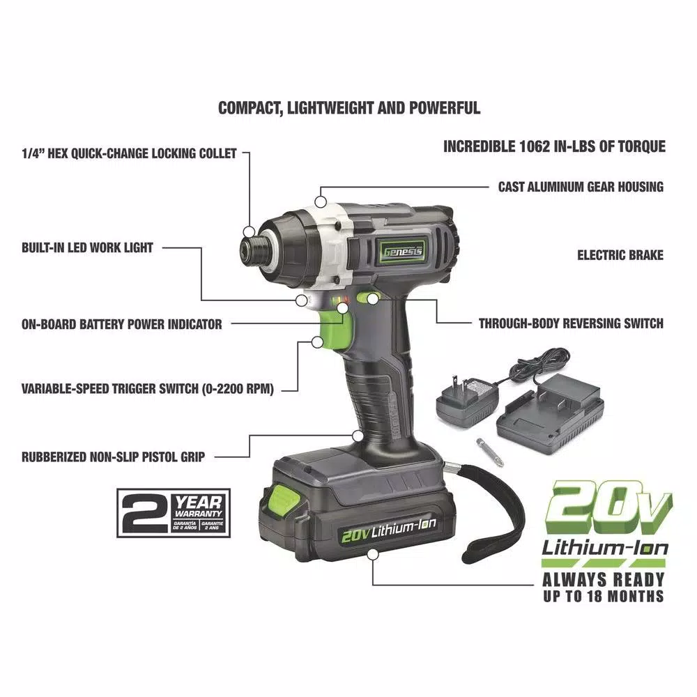 The Genesis GLID20A 20-Volt Lithium-Ion Impact Driver has a compact design with a high performance motor that delivers an incredible 1062 in./lbs. of torque power. The high-power variable speed transmission delivers 0-2200 RPM and 0-3800 IPM (Impacts Per Minute). The ergonomic handle has rubber inserts and provides comfort and control. The impact driver includes a built-in LED work light, an on-board battery power indicator and an electric brake. The tool weighs 2.5 pounds and includes a 20-Volt compact lithium-ion 1.5Ah battery pack, a compact charger and #2 Philips impact driver bit.