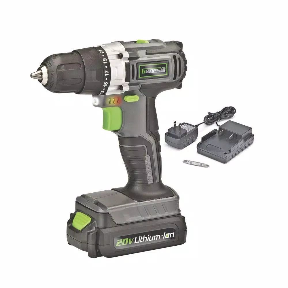 The Genesis GLCD2038A 20-Volt Lithium-Ion Drill Driver has a compact design with a high performance motor that delivers 350 in. lbs. of torque power. The high- strength transmission delivers 2 speeds for incredible power and speed. The ergonomic handle has rubber inserts and provides comfort and stable tool control. The drill driver includes a built-in LED work light, an on-board battery power indicator and an electric brake. The tool weighs 2.5 lbs. and includes a 20-Volt compact lithium-ion battery pack, a compact charger and double-ended screwdriver bit.