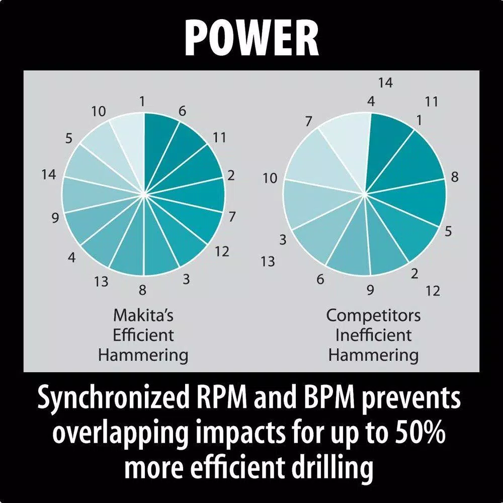 - Sequential impact timing delivers timed hammering during rotation to minimize overlapping bit impacts for up to 50% faster drilling