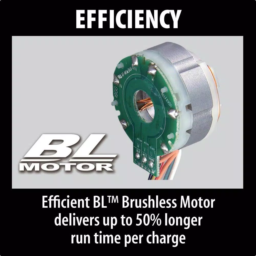 - Efficient BL brushless motor is electronically controlled to optimize battery energy use for up to 50% longer run time per charge