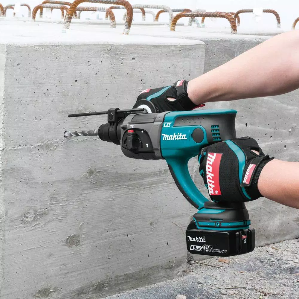 Makitaβs 18-Volt LXT Lithium-Ion Cordless 7/8 in. SDS-Plus Rotary Hammer (model XRH03T) delivers faster, more efficient percussive drilling to the jobsite. The versatile XRH03T has 3-mode operation and a built-in torque limiter to ensure stable torque control for a range of concrete drilling tasks. The LXT Lithium-Ion Battery makes this rotary hammer perfect for remote use, where running a cord is not an option. Job site tested shock absorbent handle protects the battery housing for durability. Itβs part of Makitaβs expanding 18-Volt Lithium-Ion series, the worldβs largest cordless tool line-up powered by an 18-Volt Lithium-Ion slide-style battery. Makita 18-Volt Lithium-Ion batteries have the fastest charge times in their categories, so they spend more time working and less time sitting on the charger. For improved tool performance and extended battery life, Makita created Star Protection Computer Controls. Star Protection is communication technology that allows the Star Protection-equipped tool and battery to exchange data in real time and monitor conditions during use to protect against overloading, over-discharging and overheating. For increased versatility, the tool can also be powered by Makita 18-Volt LXT and Compact Lithium-Ion batteries with the star symbol on the battery indicating Star Protection inside.