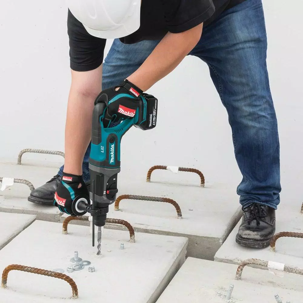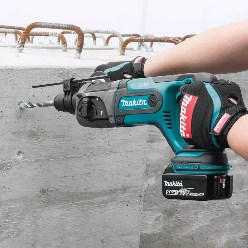 The Makita 18-Volt LXT Lithium-Ion Cordless 7/8 in. SDS-Plus Rotary Hammer (XRH04T) delivers faster, more efficient percussive drilling to the jobsite. The versatile XRH04T has 3-mode operation with a more compact design and a shock absorbent handle that protects the battery housing for added durability. The built-in clutch is engineered to reduce gear damage by automatically disengaging gears if the bit binds. The kit includes two 18-Volt LXT 5.0Ah batteries, and each reach a full charge in only 45 minutes. Itโs part of Makitaโs expanding 18-Volt Lithium-Ion series, the worldโs largest cordless tool line-up powered by an 18-Volt Lithium-Ion slide-style battery. Makita 18-Volt Lithium-Ion batteries have the fastest charge times in their categories, so they spend more time working and less time sitting on the charger. For improved tool performance and extended battery life, Makita created Star Protection Computer Controls. Star Protection is communication technology that allows the Star Protection-equipped tool and battery to exchange data in real time and monitor conditions during use to protect against overloading, over-discharging and overheating. For increased versatility, the tool can also be powered by Makita 18-Volt LXT and Compact Lithium-Ion batteries with the star symbol on the battery indicating Star Protection inside.