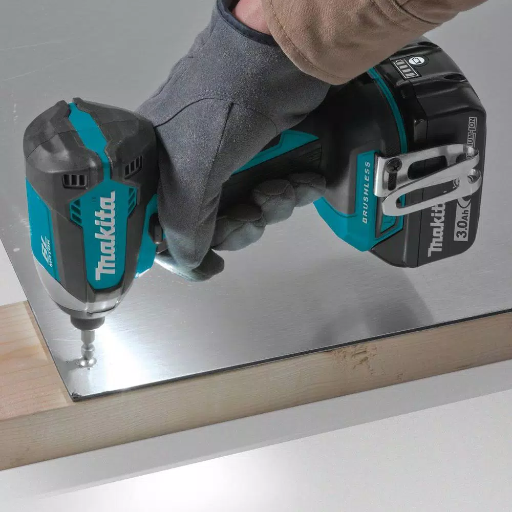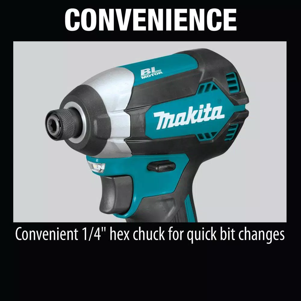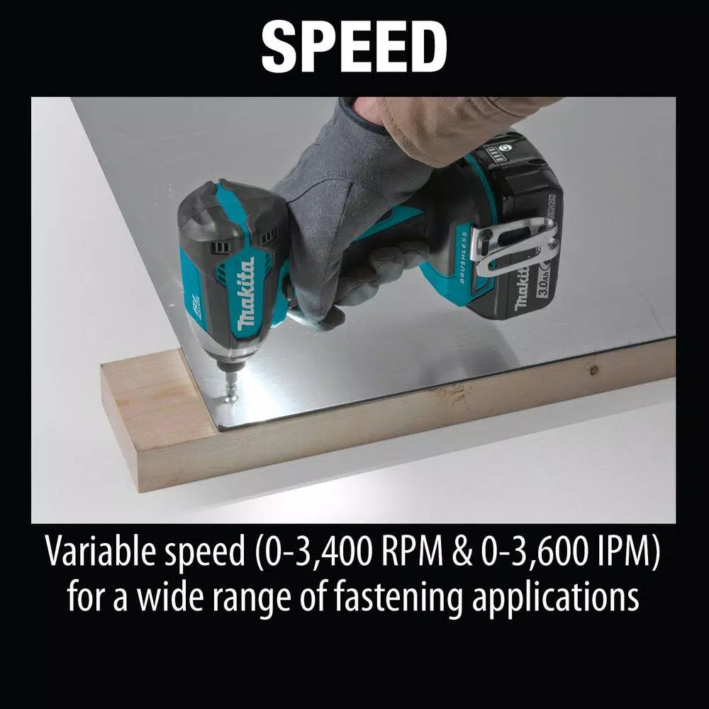 BL Brushless Motor delivers 1,500 in. lbs. of Max Torque. Variable speed (0-3,400 RPM and 0-3,600 IPM) for a wide range of fastening applications The BL Brushless Motor eliminates carbon brushes, enabling the BL Motor to run cooler and more efficiently for longer life Efficient BL Brushless Motor is electronically controlled to optimize battery energy use for up to 50% longer run time per charge The electronically-controlled BL Brushless Motor efficiently uses energy to match torque and RPM to the changing demands of the application Compact and ergonomic design at only 5 in. L Weighs only 3.3 lbs. with battery for reduced operator fatigue Convenient 1/4 in. hex chuck for quick bit changes Built-in dual LED lights illuminate the work area Rubberized soft grip provides increased comfort on the job Convenient one-touch 1/4 in. hex chuck for quick bit changes. 18-Volt LXT Lithium-Ion 3.0Ah battery BL1830B features an integrated LED battery charge level indicator 18-Volt LXT Lithium-Ion 3.0Ah battery BL1830B reaches a full charge in 30 minutes or less Makitaโs proprietary hammer and anvil impact mechanism is Manufactured using the best raw materials with the highest quality steel and Unique heat hardening process for maximum fastening and driving power. This bundle also comes with E-01666 Impact XPS 35 Piece Impact Bit Set.