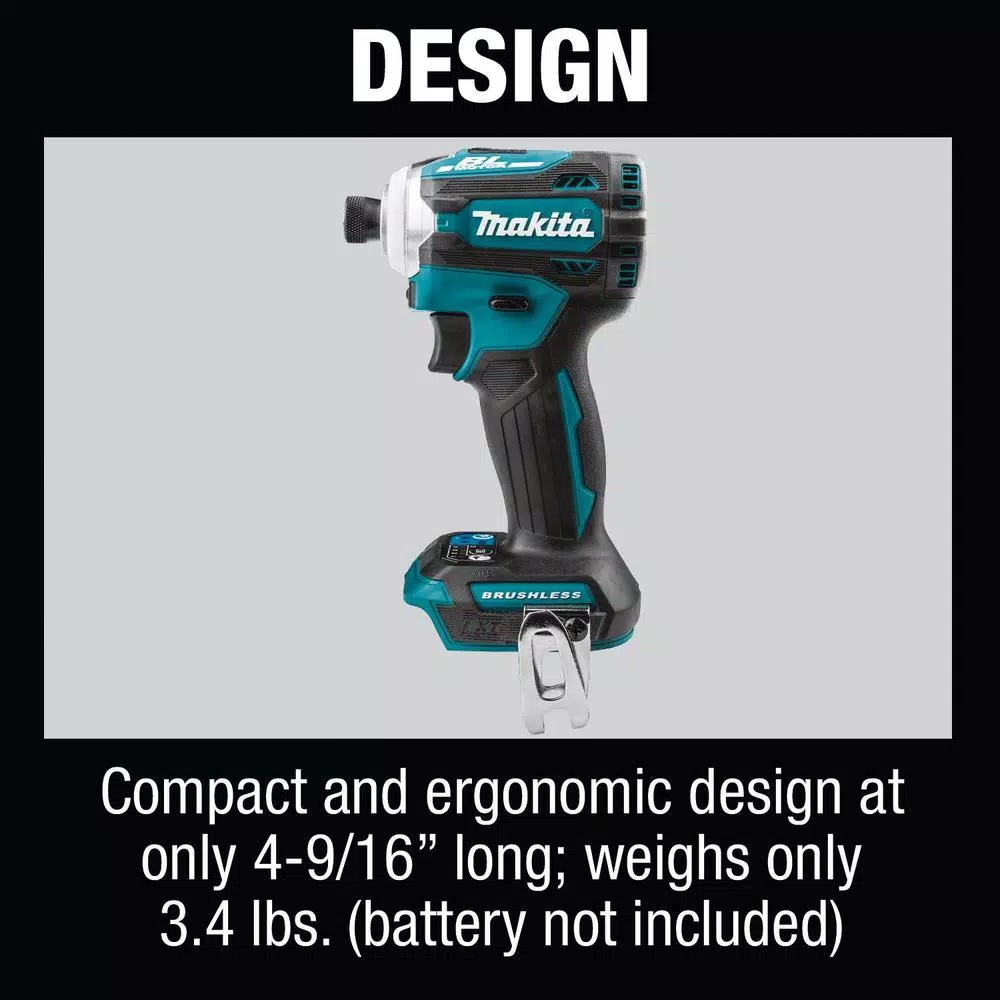 Makita has a legacy of innovation in the cordless impact driver category and the 18-Volt LXT Brushless 4-Speed Impact Driver (XDT16Z) sets new standards. The XDT16Z offers users 4 speeds, as well as Makitaโs exclusive Quick-Shift Mode for increased fastening control. Quick-Shift Mode uses the brushless motors electronic controls to find the best balance of speed and torque for each application for more efficient fastening. Another precision setting is Tightening Mode (T-mode), which downshifts and reduces rotation and impact speed prior to driving the screw into place and is engineered to minimize screw thread stripping, screw breakage and damage to work. The XDT16Z delivers industry-leading performance in a compact and ergonomic design. Added features include the 1 touch 4-speed power selector button under the chuck, which enables 1-handed speed changes and reverse rotation auto-stop mode which stops rotation and impact when the fastener is loosened adequately to help prevent over-loosening and dropped fasteners. Its part of Makitaโs expanding 18-Volt LXT system, the worlds largest cordless tool system powered by 18-Volt Lithium-Ion batteries. Makita 18-Volt LXT batteries have the fastest charge times in their categories, so they spend more time working and less time sitting on the charger. This bundle also comes with E-01351 Impact XPS 2-3/8 in. Magnetic Insert Bit Holder and E-00773 ImpactXPS #2 Phillips 2 in. Power Bit, 3-pack.