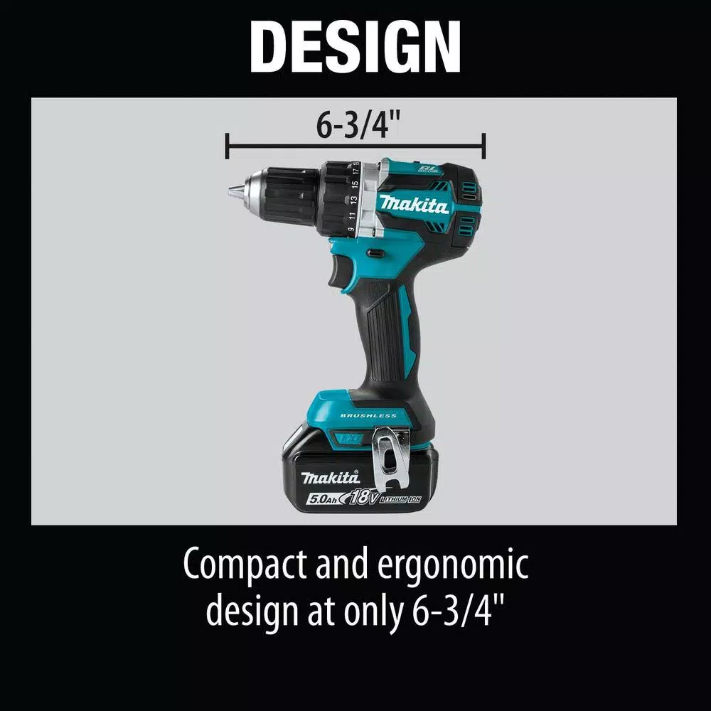 The Makita 18-Volt LXT Lithium-Ion Brushless Cordless 1/2 in. Driver-Drill Kit (XFD12T) is an ideal drilling and driving solution for the user who wants a drill with superior power-to-weight ratio. The XFD12T combines 530 in. lbs. of Max Torque with an efficient brushless motor that delivers up 50% more work per charge, increased power and speed and longer tool life. For the pro user this means more drilling and driving power, greater productivity and fewer trips up and down the scaffolding or ladder to get to the battery charger. In driver mode, the adjustable torque settings provide more control for a full range of applications, from large fasteners to smaller, delicate screws. It weighs only 3.9 lbs. (with 5.0Ah battery) for increased comfort and superior power-to-weight ratio. The XFD12T is compatible with Makita 18-Volt LXT Lithium-Ion batteries, from the fast-charging 18-Volt LXT Compact 2.0Ah battery to full-size 18-Volt LXT batteries for longer run time. For improved tool performance and extended battery life, Makita created Star Protection Computer Controls. Star Protection is communication technology that allows the Star Protection-equipped tool and battery to exchange data in real time and monitor conditions during use to protect against overloading, over-discharging and overheating. For increased versatility, the tool can also be powered by Makita 18-Volt LXT and Compact Lithium-Ion batteries with the star symbol on the battery indicating Star Protection inside.