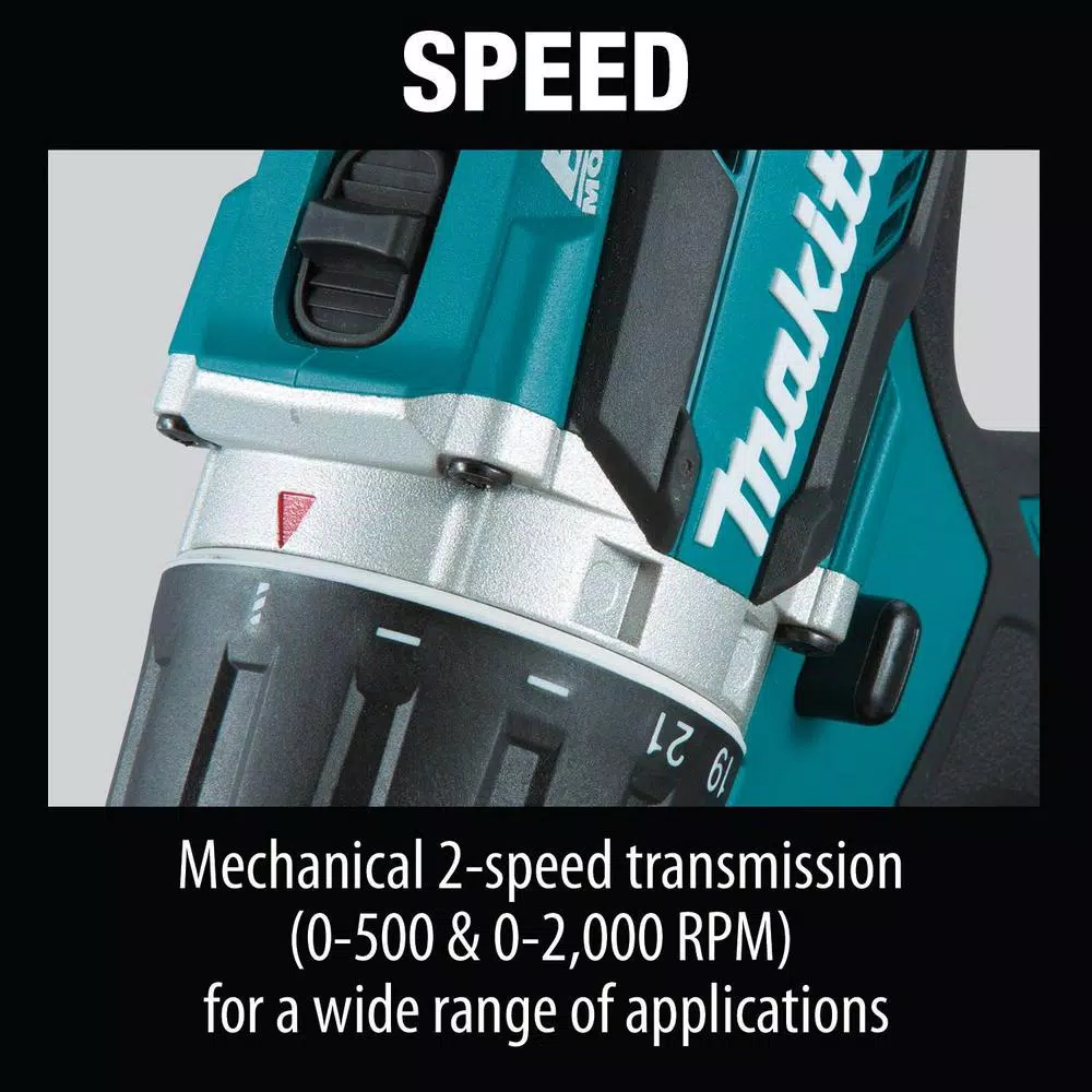 - Mechanical 2-speed transmission (0 RPM to 500 RPM and 0 RPM to 2,000 RPM) for a wide range of drilling and fastening applications