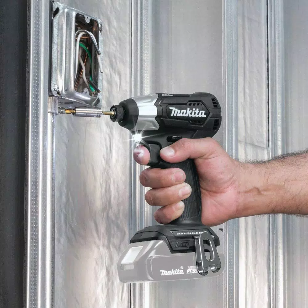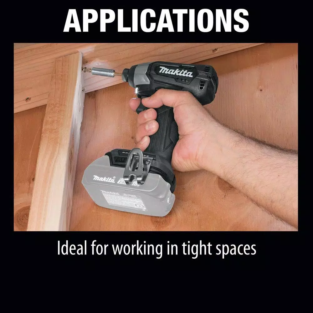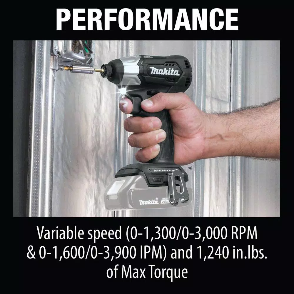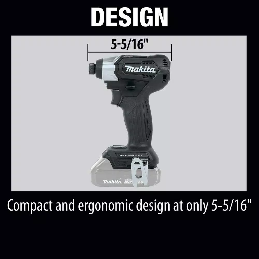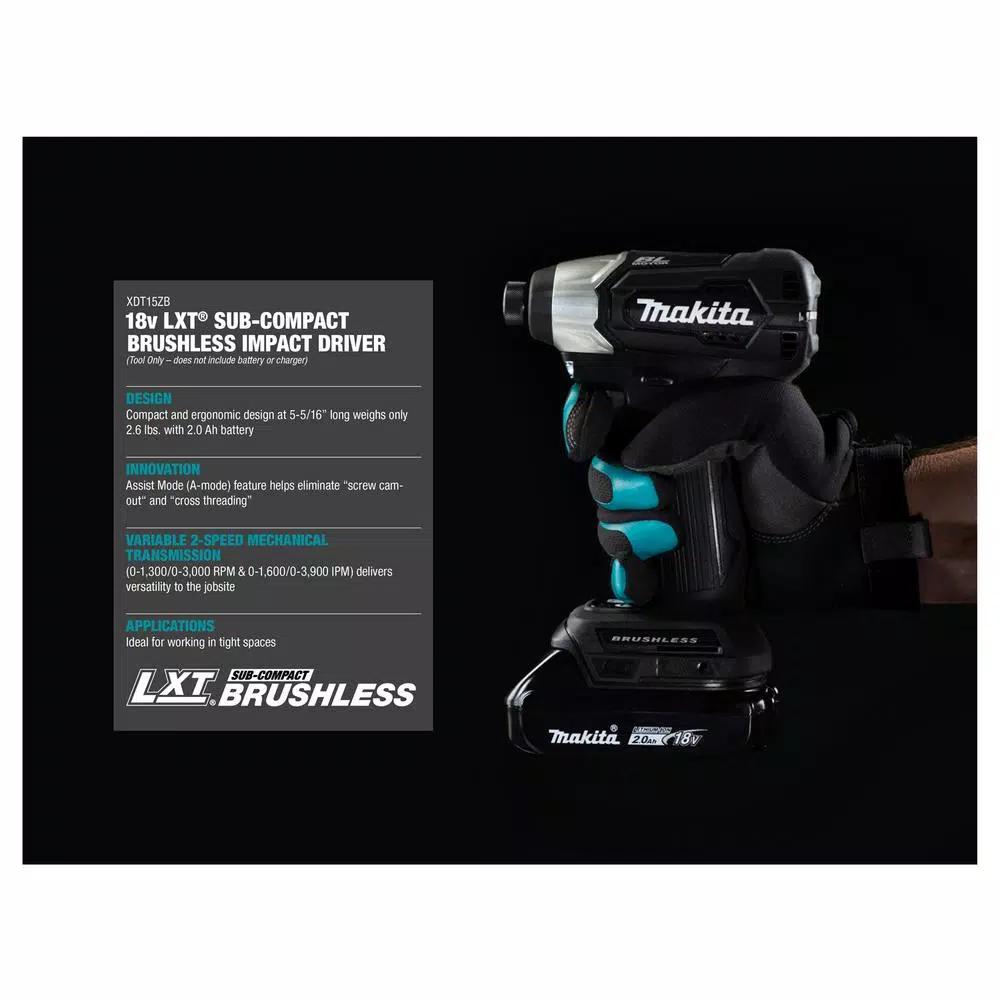 Do more with less. The Makita 18-Volt LXT Lithium-Ion Sub-Compact Brushless Cordless Impact Driver (model XDT15ZB, tool only, battery sold separately) is an ultra-compact fastening solution with significantly less weight. The 18-Volt Sub-Compact Impact Driver is part of a new class of compact, with the size and weight of lower voltage tools but with the performance, power and compatibility of 18-Volt. The expansive breadth-of-line of the Makita 18-Volt LXT Series means an 18-Volt battery from any LXT tool will power the 18-Volt Sub-Compact Impact Driver. The XDT15ZB has an efficient brushless motor with 2-speed settings and dual LED lights illuminate the work area. The innovative Assist Mode (A-mode) helps eliminate screw cam-out and cross threading by driving at low speed until tightening begins and is ideal for driving longer fasteners. At only 5-5/16 in. and 2.6 lbs. (with battery, sold separately) it is an ultra-compact fastening solution with superior comfort and handling. Itโs part of Makitaโs expanding 18-Volt Lithium-Ion series, the worldโs largest cordless tool line-up powered by 18-Volt Lithium-Ion slide-style batteries. Makita 18-Volt Lithium-Ion batteries have the fastest charge times in their categories, so they spend more time working and less time sitting on the charger.