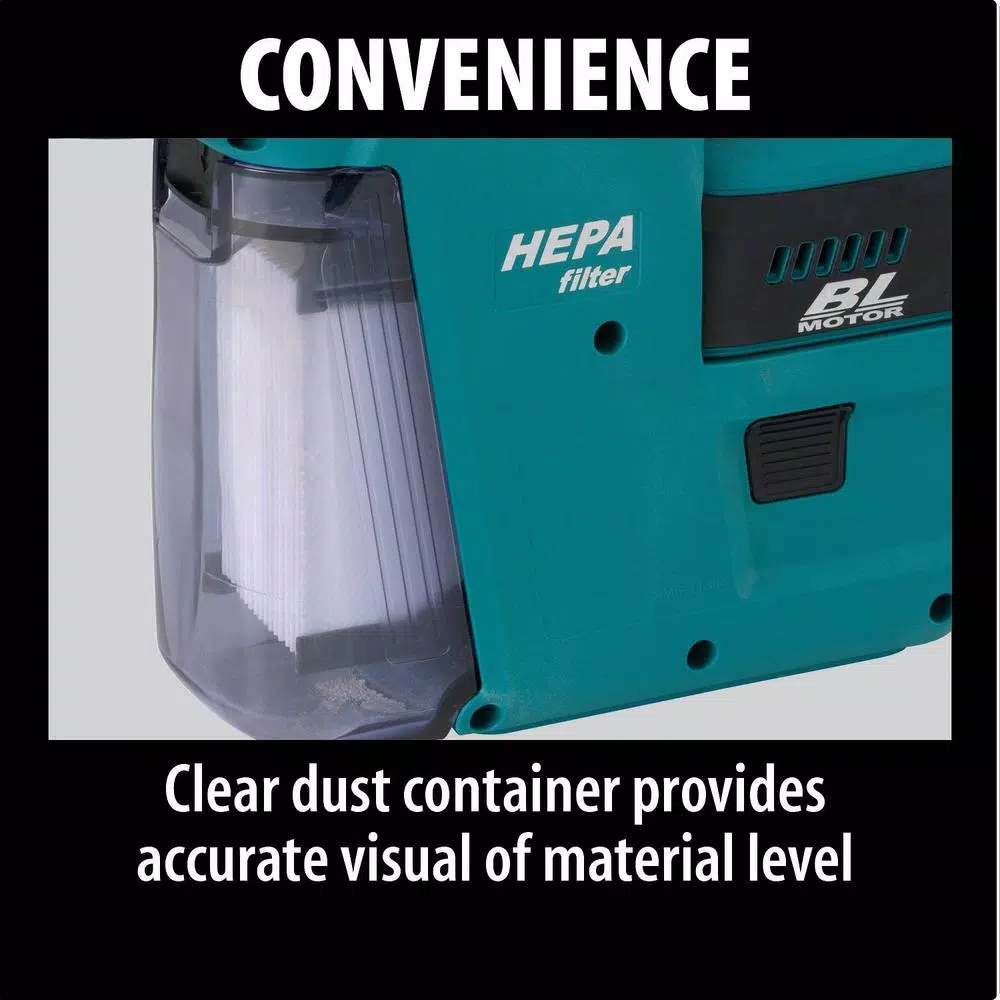 The 18-Volt LXT Lithium-Ion Brushless 1 in. Rotary Hammer with HEPA Dust Xtraction Vacuum Attachment (model XRH011TX) combines Makita BL Brushless Motor Technology with concrete dust extraction โ without the cord. The XRH011TX is the industryโs first 1 in. capacity rotary hammer in the 18-Volt category and sets new standards in the cordless tool category. The XRH011TX is powered by an efficient BL Brushless Motor with variable speed that delivers 0-950 RPM, 4,700 BPM and 2.4 Joules with up to 50% longer run time than current Makita 18-Volt LXT rotary hammers. The separate vacuum motor also increases suction efficiency without sacrificing the performance of the rotary hammer. The HEPA Dust Extraction Vacuum Attachment is trigger-activated for user convenience. The rubber suction gasket is engineered to provide consistent contact with the work surface, where the dust is channeled to the clear dust container with HEPA filter, which captures 99.95% of dust particles (size 0.3 microns). After the trigger is released, the 2-second extended suction collects remnant dust and particles as the bit is being pulled out of the work surface, making the XRH011TX ideal for overhead drilling. This Promotion also comes with a bonus XT269T 18V LXT Lithium-Ion Brushless Cordless 2-Pc. Combo Kit (5.0Ah).