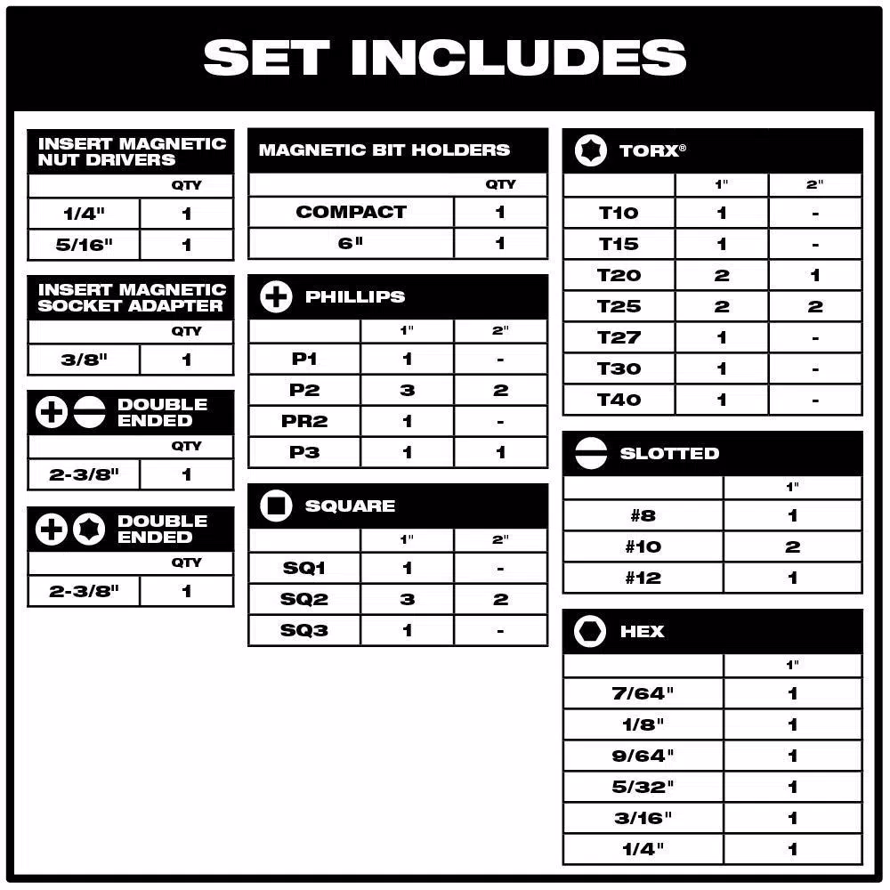 - Includes: (1) 2401-20 M12 cordless lithium-ion screwdriver, (2) 48-11-2401 1.5 Ah M12 REDLITHIUM batteries, (1) 48-59-2401 M12 lithium-ion battery charger, (1) contractor bag, (1) belt clip and (1) 48-32-4023 SHOCKWAVE Impact Duty steel driver bit set (45-piece)