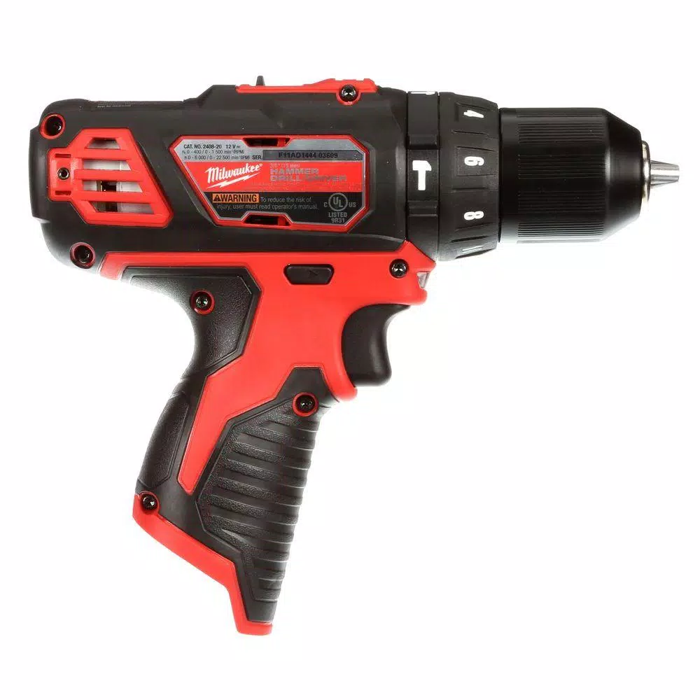 The M12 3/8 in. hammer drill/driver is the only tool in its class with an all-metal chuck, one of the reasons professionals turn to Milwaukee for durable equipment. This 12 volt lithium-ion subcompact supplies up to 275 in. lbs. of torque and features a ratcheting chuck to ensure bits stay securely fastened under ever-increasing loads. Choose between two speed settings (0-400 or 0-1500 RPM) and one of 18 clutch positions for optimal torque. The contoured handle enables firm command and control while the responsive variable-speed trigger reacts quickly to user actions.