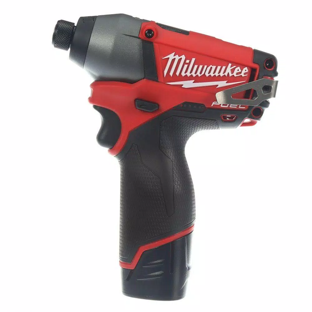 - Includes: (1) M12 FUEL 1/4 in. hex impact driver, (2) M12 REDLITHIUM compact batteries, (1) M12 lithium-ion 30-minute charger, (1) carrying case and (1) removable belt clip