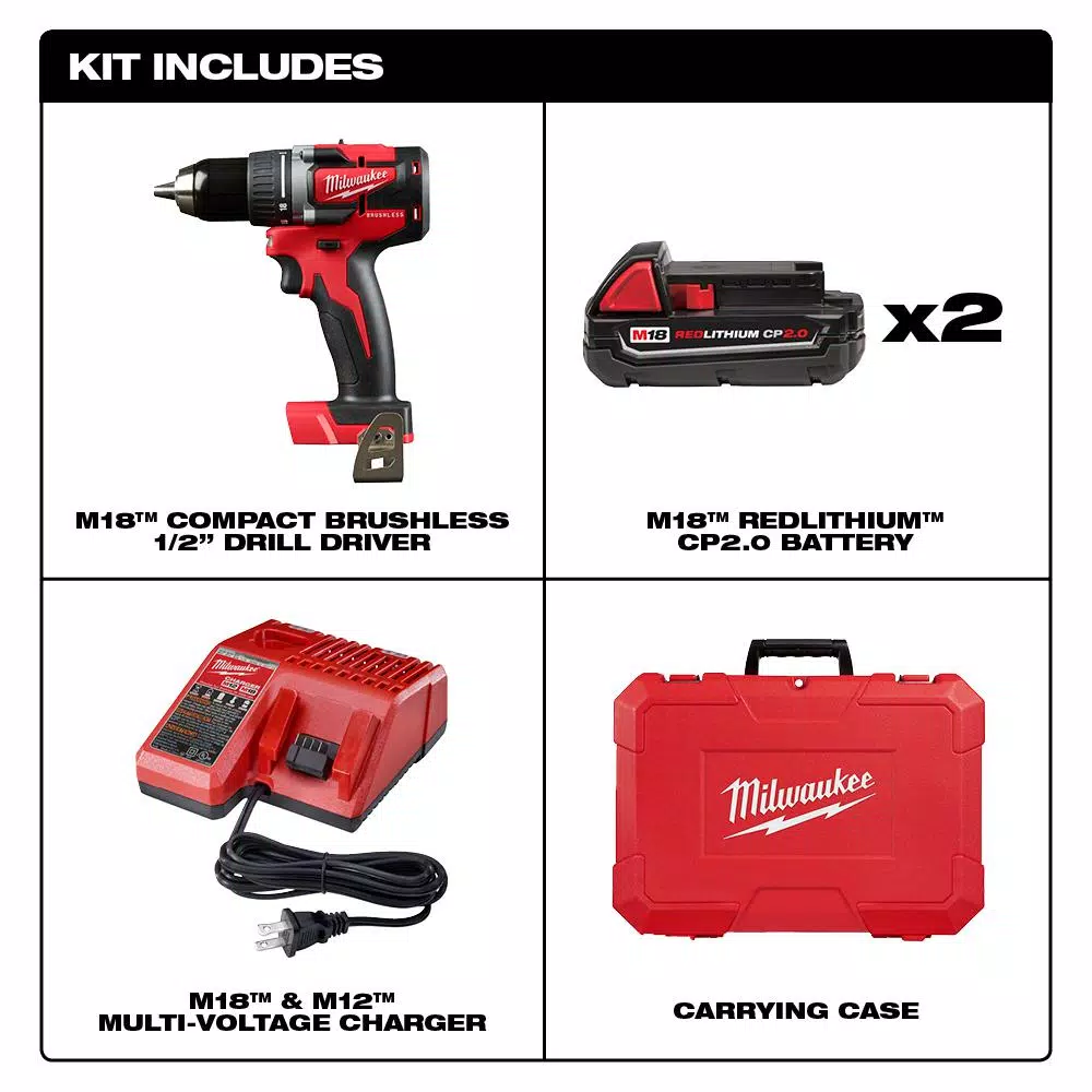 The MILWAUKEE M18 1/2 in. Compact Brushless Drill/Driver Kit is the best drill in class, delivering unmatched power while maintaining its compact size. The brushless motor was built to ensure optimal tool performance. Built-in REDLINK power tool technology paired with REDLITHIUM batteries ensure these compact drills provide efficient power delivery resulting in less down time recharging batteries. The brushless drillβs compact body is 6-1/2 in. long and lightweight at 3.4 lb. with the battery attached. Its small, light build allows for excellent control, especially while working in overhead or tight spaces. The compact drill/driver delivers 500 in. lbs. of torque and 0-500/0-1,800 RPM, able to tackle a wide range of drilling and fastening applications. The cordless compact drill has an all-metal gear case and 1/2 in. metal chuck. The compact brushless kit comes with the 1/2β³ drill/driver, two M18 REDLITHIUM CP2.0 compact batteries, a M18/M12 Multi-Voltage Charger and Carrying Case.