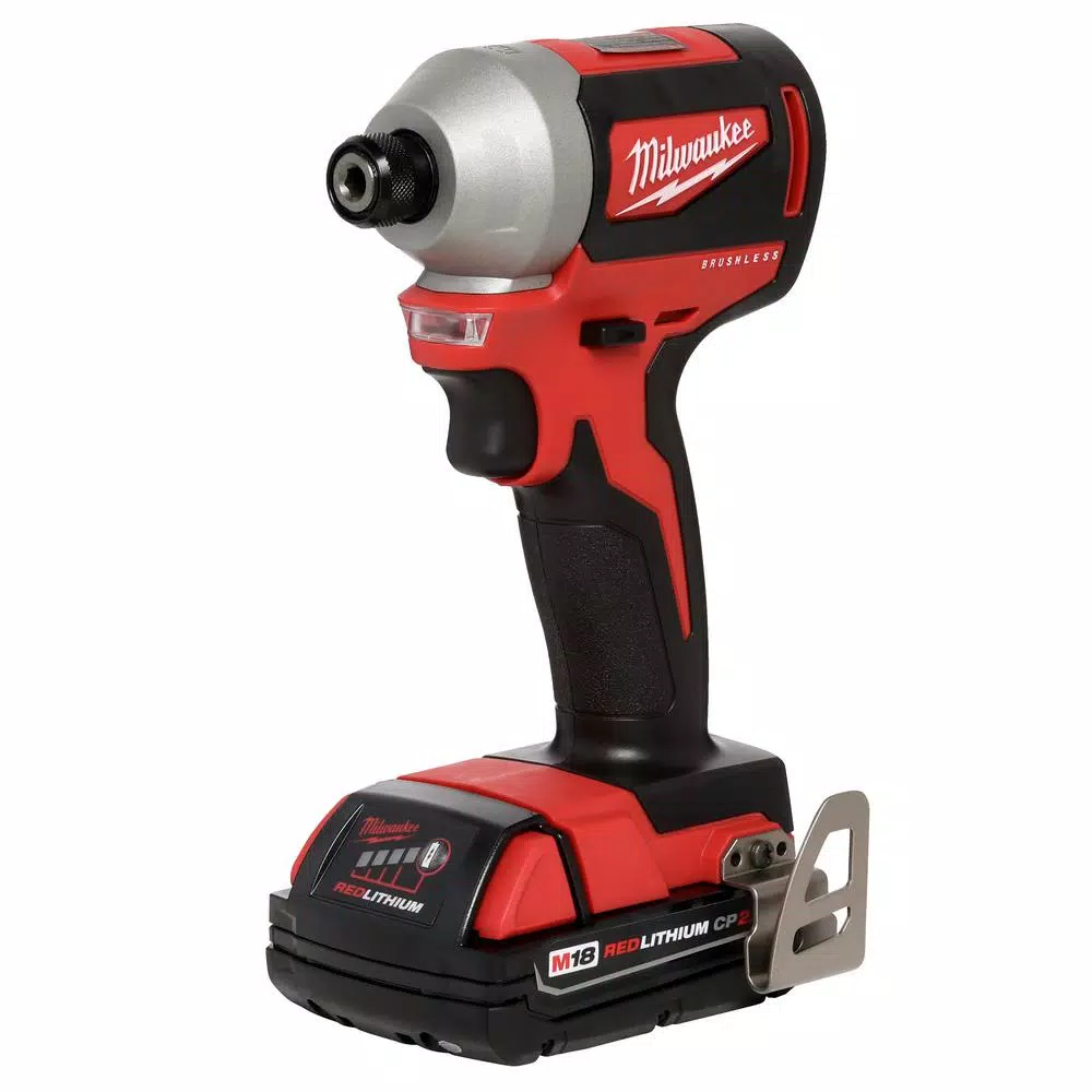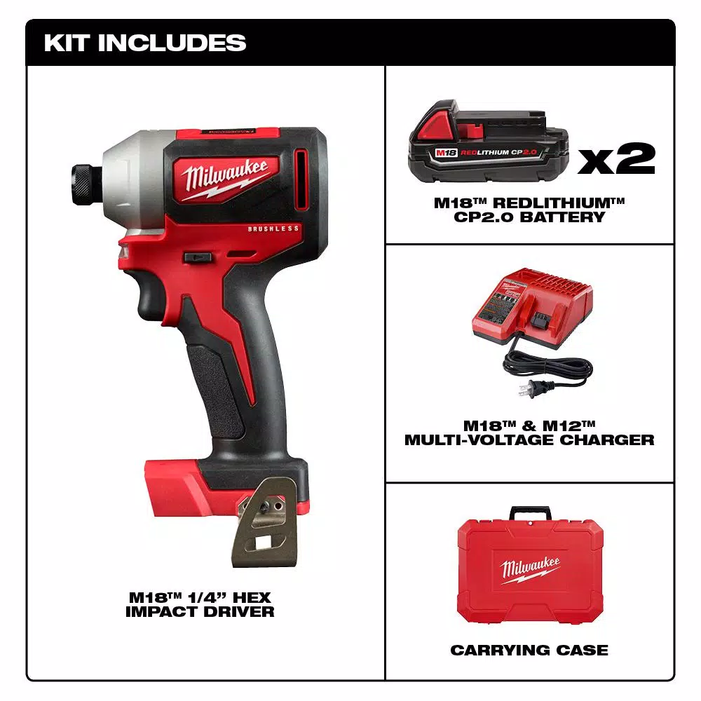 - Includes: M18 compact brushless 1/4 in. hex impact driver 2850-20, two 48-11-1820 M18 REDLITHIUM 2.0 compact batteries, 48-59-1812 M18-M12 multi-voltage charger, carrying case