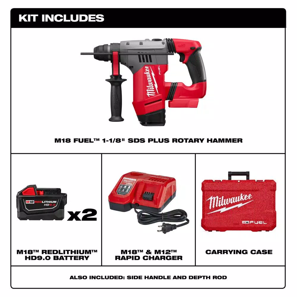- Includes: (1) M18 FUEL 1-1/8 in. SDS Plus rotary hammer (bare tool) (2712-20); (2) M18 REDLITHIUM HIGH DEMAND 9.0 battery pack (48-11-1890); (1) M18 and M12 rapid charger (48-59-1808); (1) depth rod; (1) side handle; (1) carrying case