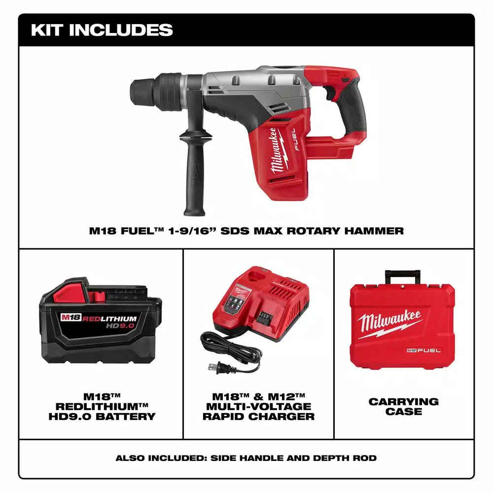 - Includes: tool kit: 2717-20 1-9/16 in. SDS-Max rotary hammer, (1) M18 REDLITHIUM 9.0 high demand battery packs, rapid charger, side handle and carrying case