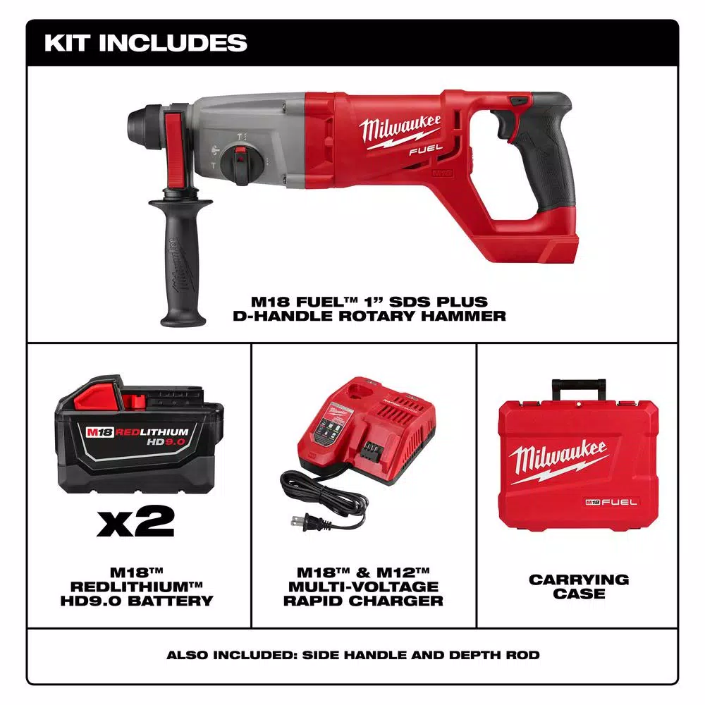 - Includes: (1) M18 FUEL 1 in. SDS-Plus D-handle rotary hammer (tool-only) (2713-20); (2) M18 REDLITHIUM HIGH DEMAND 9.0 battery pack (48-11-1890); (1) M18 and M12 rapid charger (48-59-1808); (1) depth rod; (1) side handle; (1) carrying case