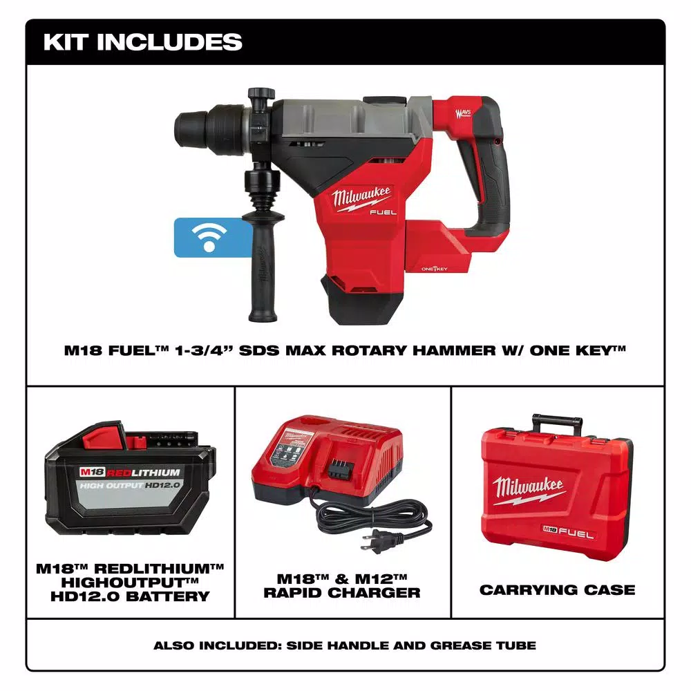 The MILWAUKEE® M18 FUEL™ 1-3/4″ SDS Max Rotary Hammer with ONE KEY™ kit generates the power of a 15A Corded Rotary Hammer. It has a 1-3/4″ capacity, 8.1 ft-lbs of impact energy, 380 RPM, and 2,900 BPM. The cordless rotary hammer is designed for the professional user, allowing ultimate power, control, enhanced safety, and productivity. The POWERSTATE™ Brushless Motor delivers 8.1 ft-lbs of impact energy that meets and rivals that of corded competition. REDLINK PLUS™ intelligence tool technology ensures maximum rotary drill performance and protects it from overload, overheating, and over discharge. The M18 REDLITHIUM™ High Output HD12.0 battery delivers unmatched run-time in all applications when used with the rotary hammer drill. It allows the SDS Max hammer drill to chip 1/2 ton of material per charge so users can work harder for longer. The full feature hammer delivers maximum control and enhanced safety with the AUTOSTOP™ E-Clutch. This prevents over-rotation in case the tool gets bound up while being used in drilling rebar or hard aggregate applications. Competitive tools can rotate up to 360 degrees while the Milwaukee rotary hammer will stop rotating at 45 degrees when the tool gets bound up. This feature is designed to ensure users have more control while on the job. The cordless rotary hammer is compatible with ONE KEY™, wirelessly connecting to user’s smartphone to track and manage the tool’s performance and location.
