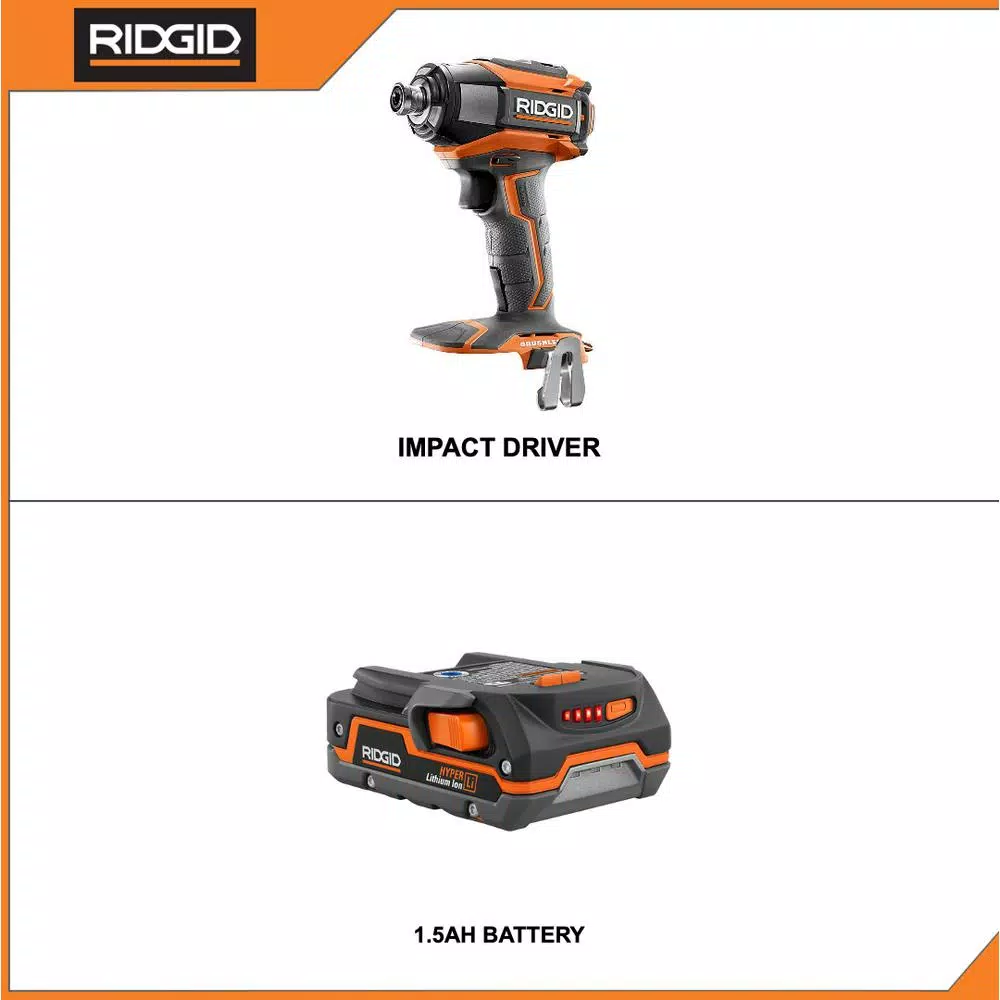 RIDGID introduces the 18-Volt Lithium-Ion Cordless Brushless 1/4 in. 3-Speed Impact Driver with Belt Clip with 1.5 Ah Lithium-Ion Battery. With a powerful 2,250 in./lbs. of torque there is no job that this impact driver cannot handle. Brushless Motor Technology gives you up to 50% more runtime, longer tool life, and improved performance. Backed by the Industry Leading RIDGID Lifetime Service Agreement, the Brushless 1/4 in. Impact Driver includes a belt hook with screws, a Phillips bit, and an operatorโs manual. The included 18-Volt 1.5 Ah Compact Lithium-Ion Battery is equipped with an on board fuel gauge, increased temperature range for powering tools and improved run time. The battery produces industry leading performance in run time, recharges and extreme weather performance. Backed by the RIDGID 3-Year Manufacturerโs Warranty, the 18-Volt 1.5 Ah Compact Lithium-Ion Battery includes an operatorโs manual. Charger not included.