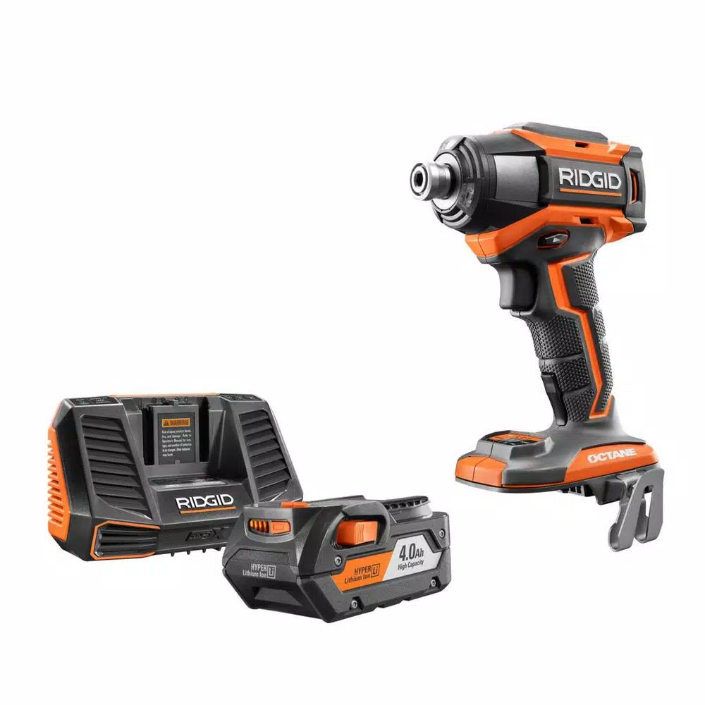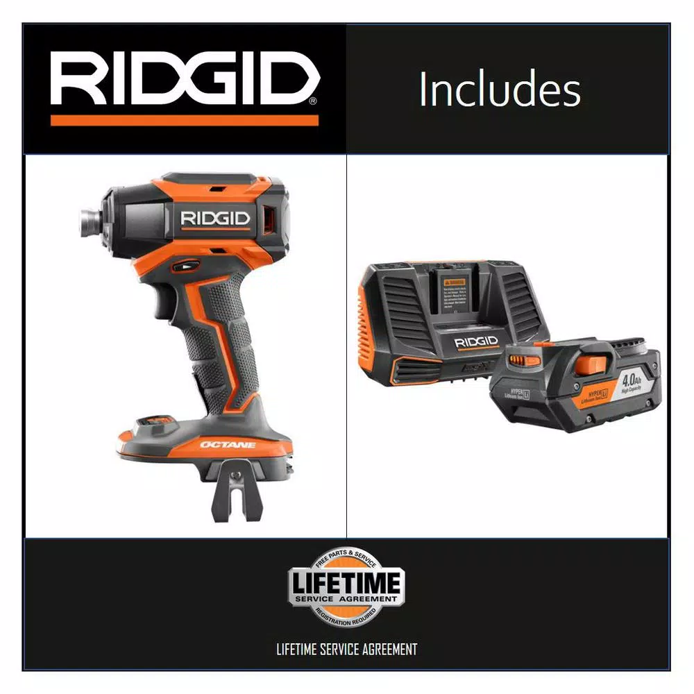 RIDGID introduces the 18-Volt OCTANE 6-Mode 1/4 in. Impact Driver with 18-Volt Lithium-Ion 4.0 Ah Battery and Charger Kit. The 18-Volt OCTANE Brushless 6-Mode 1/4 in. Impact Driver features high performance brushless motors and advanced electronics that provide Best-in-Class power and intelligence. While providing increased performance with all RIDGID 18-Volt Batteries, OCTANE Tools provide maximum performance in high demand applications when paired with OCTANE Batteries. Paired with an OCTANE Battery, this Impact Driver gives an Industry Leading 2,400 in./lbs. of torque. The battery in this kit gets up to 4X the runtime of standard lithium-ion batteries and is built for high performance and protected from overheating, overloading, and overcharging through the Triple Protection Electronics design. The chemistry allows for maximum performance in temperatures as low as -4 degrees and up to 120 degrees F, so you can confidently use them year-round. The 18-Volt Charger features Rapid Charge Time, Smart Charging, Cold/Hot Warning, and Energy Save Mode. With registration, this kit is backed by the Industryโs Only Lifetime Service Agreement. The OCTANE Brushless 6-Mode 1/4 in. Impact Driver includes a Phillips Driving Bit, a belt hook and screw, 4.0 Ah Battery, Charger, and operatorโs manual.
