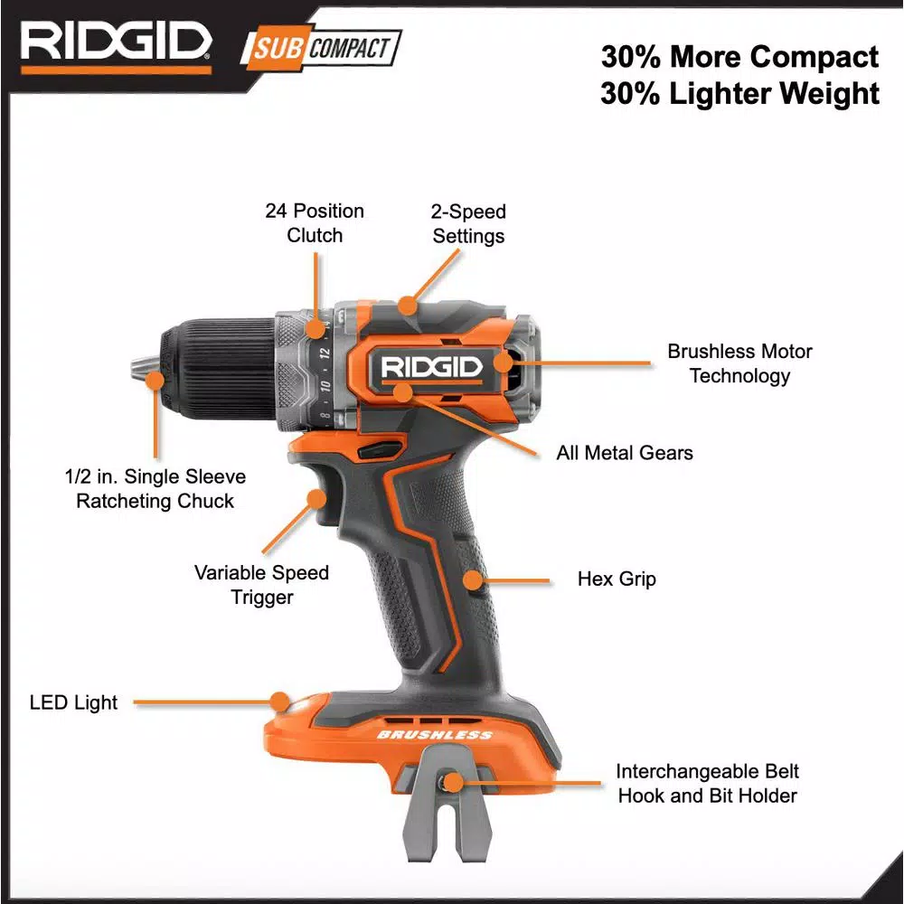- Subcompact model is 30% less weight and 30% more compact in comparison to RIDGID Brushless 1/2 in. Drill/Driver R86009