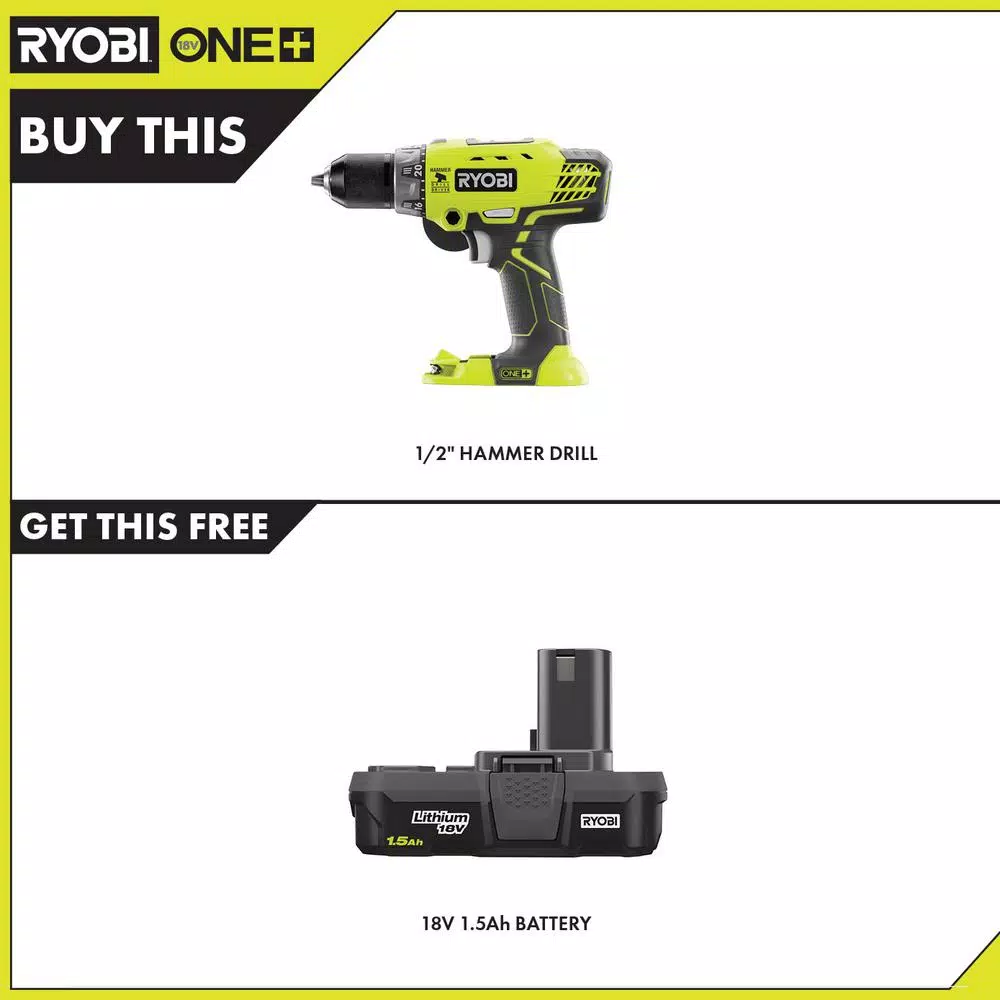 RYOBI introduces the 18-Volt ONE+ Cordless 1/2 in. Hammer Drill/Driver with 1.5 Ah Compact Lithium-Ion Battery. This hammer drill/driver features a variable 2-speed transmission for precision and versatility and delivers up to 1,600 RPM and 24,000 BPM for powerful performance. The 24-position clutch handles high-torque applications and the clutch override allows quick mode changes from drilling to driving. The improved GRIPZONE overmold provides optimum grip and user comfort. The RYOBI 18-Volt ONE+ 1/2 in. Cordless Hammer Drill/Driver works with all RYOBI 18-Volt ONE+ batteries. The included battery features lithium-ion cells, providing the user with over 50% more runtime compared to the (P102) 18-Volt ONE+ Lithium-Ion 1.3 Ah Compact Battery. Featuring Extreme Weather Performance, this battery can withstand frigid weather conditions and is engineered to deliver fade-free power for maximum performance. Best of all, it is part of the RYOBI ONE+ System of over 175 cordless tools that all work on the same battery platform. Backed by the RYOBI 3-Year Manufacturer’s Warranty, the 1/2 in. Hammer Drill/Driver includes an auxiliary handle, a screwdriver bit, an 18-Volt ONE+ 1.5 Ah Compact Lithium-Ion Battery, and an operator’s manual. Charger sold separately.