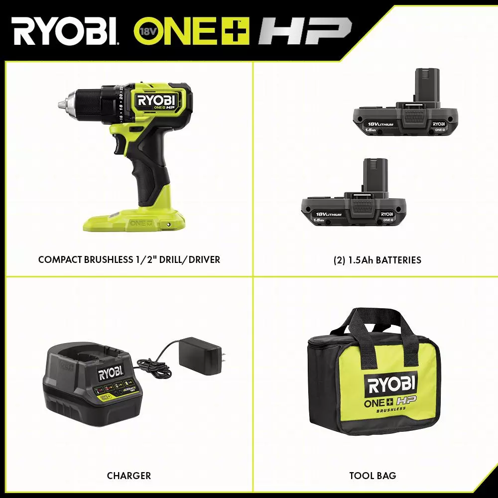 - (1) PSBDD01 ONE+ HP 18V Compact Brushless Cordless 1/2 in. Drill/Driver, (2) PBP002 ONE+ 18V 1.5 Ah Batteries, (1) 18V Lithium-Ion Charger, tool bag, and operator’s manuals