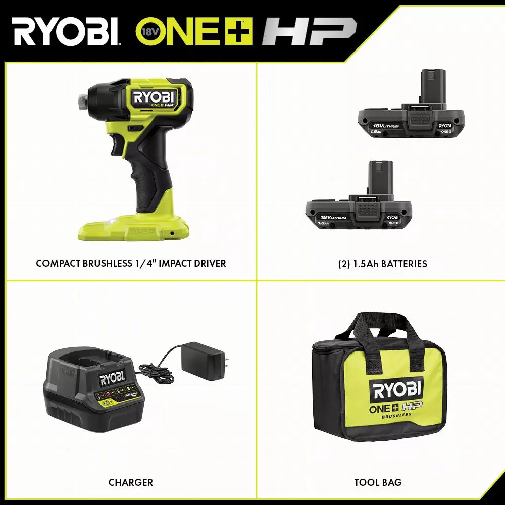 - Includes: (1) PSBID01 ONE+ HP 18V Compact Brushless 1/4 in. Impact Driver, (2) PBP002 ONE+ 18V 1.5 Ah Batteries, (1) 18V Lithium-Ion Charger, tool bag, and operator’s manuals