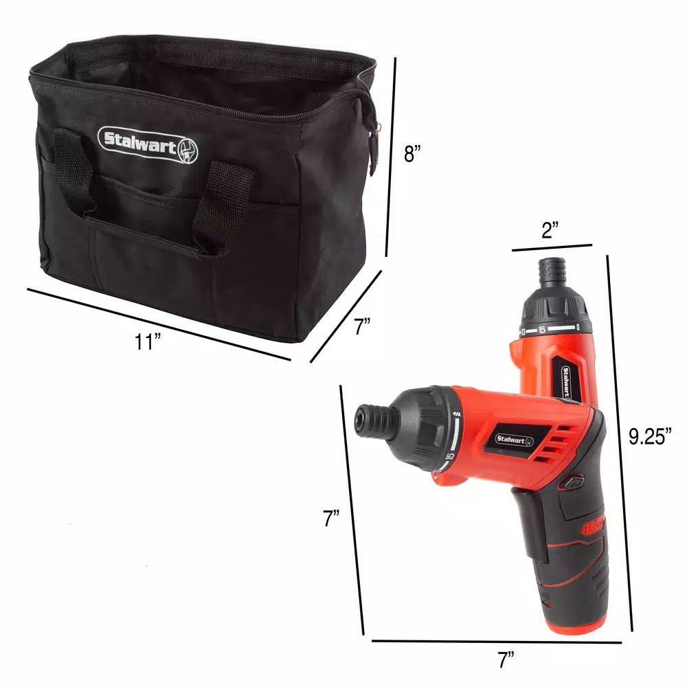 Never be left without the proper tool for the job with the 3.6-Volt Lithium Cordless Drill and 101-piece Accessory Set by Stalwart. The accessory set has everything from screwdriver bits to wood and metal drill bits. The drill itself is powered by a 3.6-Volt lithium ion battery that gives a longer use time and holds a charge better than nickel-cadmium batteries. The handle is ergonomic and comes with a rubberized coating to enhance comfort and reduce user fatigue. The drill has a 1/4 in. keyless chuck for fast, convenient bit installation and removal and 15 plus 1 torque settings for precision drilling and driving in any material. The entire kit comes in a 600D Oxford cloth carrying bag to keep the accessories organized and make the kit ideal for travel. The top of the bag opens extra wide to provide easy access to your drill and accessories. The built-in LED light turns on when the trigger is pressed, providing extra light in dim areas. The drill has a swivel hinge in the handle to use either at an angle or to extend your reach in small areas.