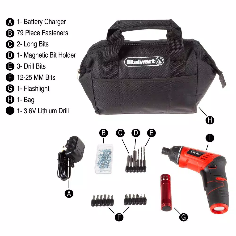 - Includes: 3.6-Volt lithium drill, twelve 25 mm bits, 3 drill bits, 1 magnetic bit holder, 1 flashlight, battery charger, bag, 79 fasteners
