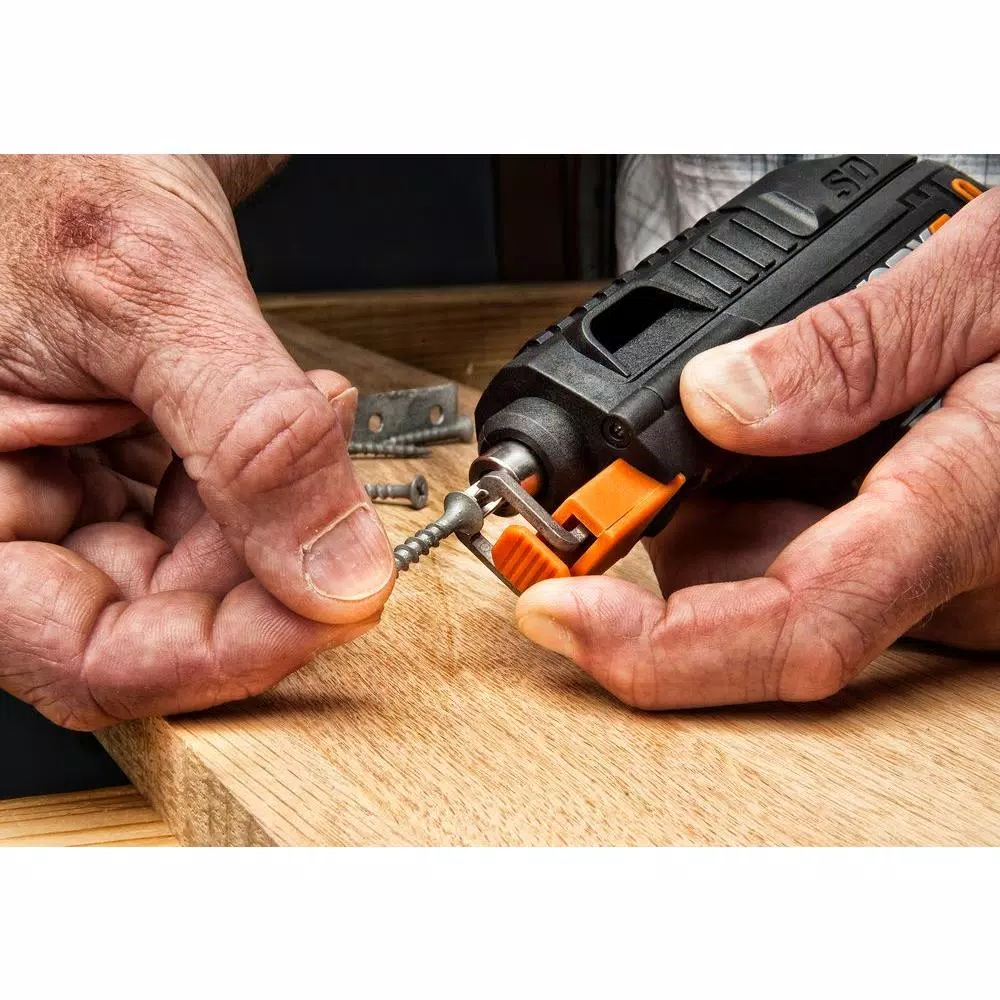 The SD Driver with Screw Holder is for professionals or DIY-ers that have a lot of work to get done. Using a manual screwdriver can strain your hands pretty quickly, and everyone drops fasteners and bits on the ground. Eliminate those two problems with this semi-automatic driver and bit changer—with a screw holder built right in. You just press the orange button on the tip to get the jaws to accept the screw. Then with just one hand, you can maneuver into tight spaces and drill it home. The jaws work when you need to back screws out, too. Your six favorite bits are stored onboard, and you cycle between them by shifting the top piece back towards you. With 0-230 revs/min of no-load speed, you’ll have enough torque to handle the most common screwdriver applications. And the LED headlamp lets you see what you’re doing, even in the dark. The internal 4V battery will hold a charge for up to 18 months, so you can toss the SD Driver on a shelf and it’ll be ready to go the next time you pick it up. A charger comes with it, as does the reloadable bit cartridge, which is stocked with 6 of the most common bits already. Save your hands and stop losing bits and fasteners. Get screws into places you never thought possible before. The SD Driver with Screw Holder is a solution to a couple of problems that come with using a regular screwdriver. Luckily, you don’t have to worry about those anymore.